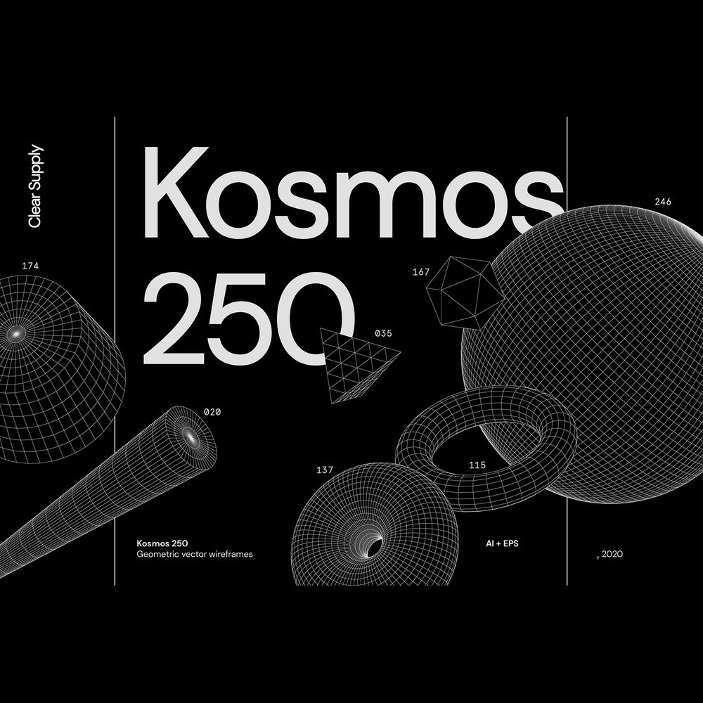Kosmos 250 is a collection of two hundred and fifty (250) geometric vector wireframes. Polygon count varies greatly between objects - the amount of detail ranges from safe to sorry. Each item features an optional background shape. The paths and strokes are fully scalable and editable.