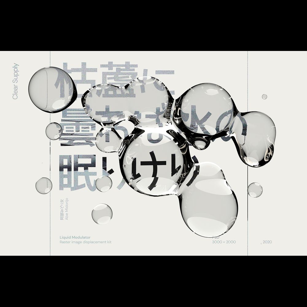 Liquid Modulator is a collection of 60 unique high resolution renders with an alpha channel. You can use them to bring dynamics to your designs by simply displacing your image in Photoshop and overlaying a render over it. At 3000 × 2000 px, the collection is suitable for both screen and print. For unique compositions, combine your own from elements in the collection. The package contains 60 renders (PSD, PNG) + 60 previews (JPG). Haiku poems by Abe Midorijo & Hekigotō Kawahigashi