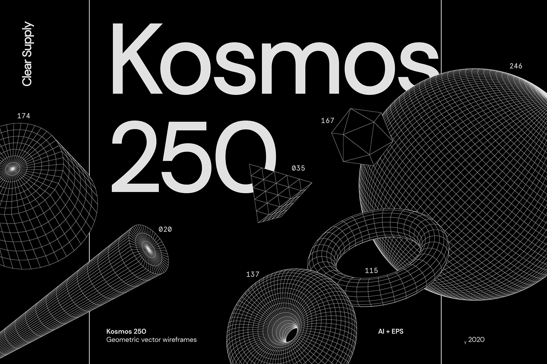 Kosmos 250 is a collection of two hundred and fifty (250) geometric vector wireframes. Polygon count varies greatly between objects - the amount of detail ranges from safe to sorry. Each item features an optional background shape. The paths and strokes are fully scalable and editable.
